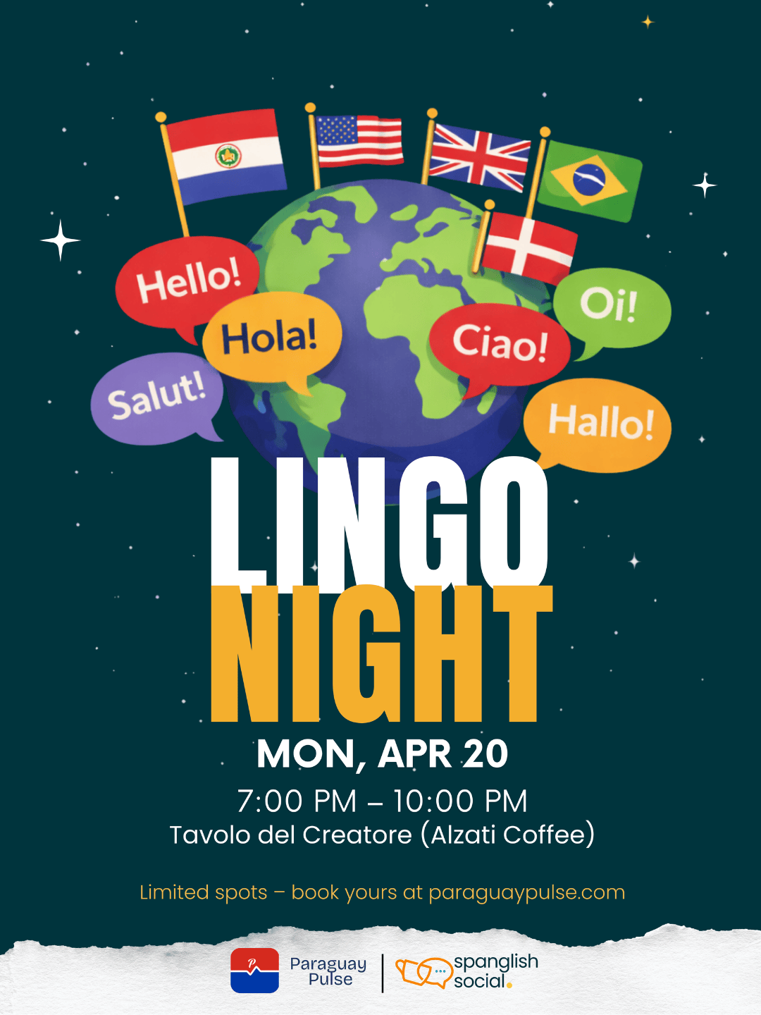 Spanglish is a language exchange community where Spanish and English speakers come together to practice, learn, and connect. Our monthly events create a friendly environment for language learning through real conversations.